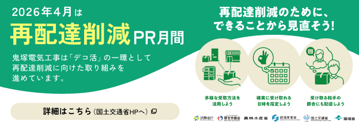 詳しくはこちら(外部リンク)日時:2025.07.16 更新 - 鬼塚電気工事は、昨年に引き続き「デコ活」の一環として関係省庁が取り組んでいる再配達削減 PR 月間に協力し、再配達削減に向けた取組を進めています。